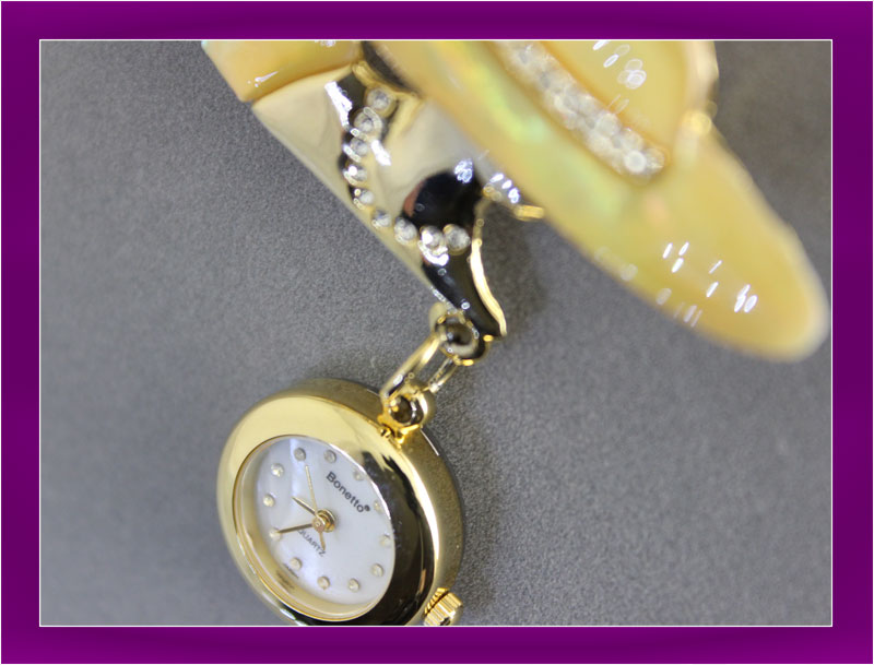 the neck as a necklace. You will also see that each hour on the watch is marked with a rhinestone. The brooch has a safety