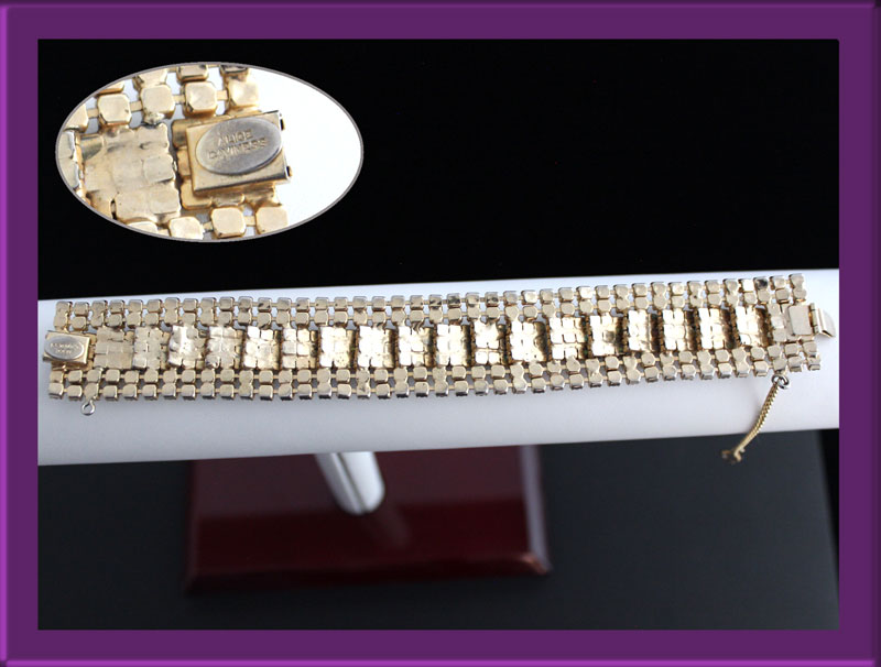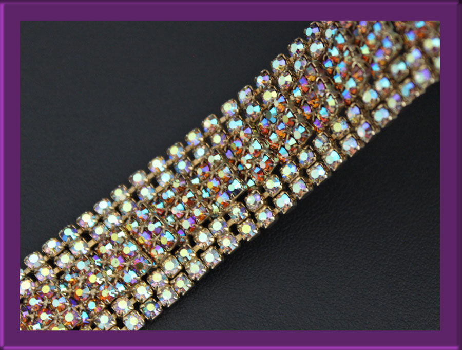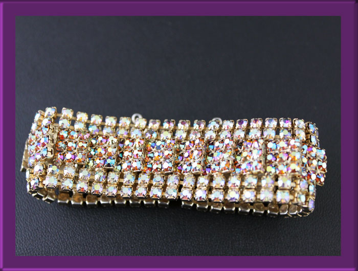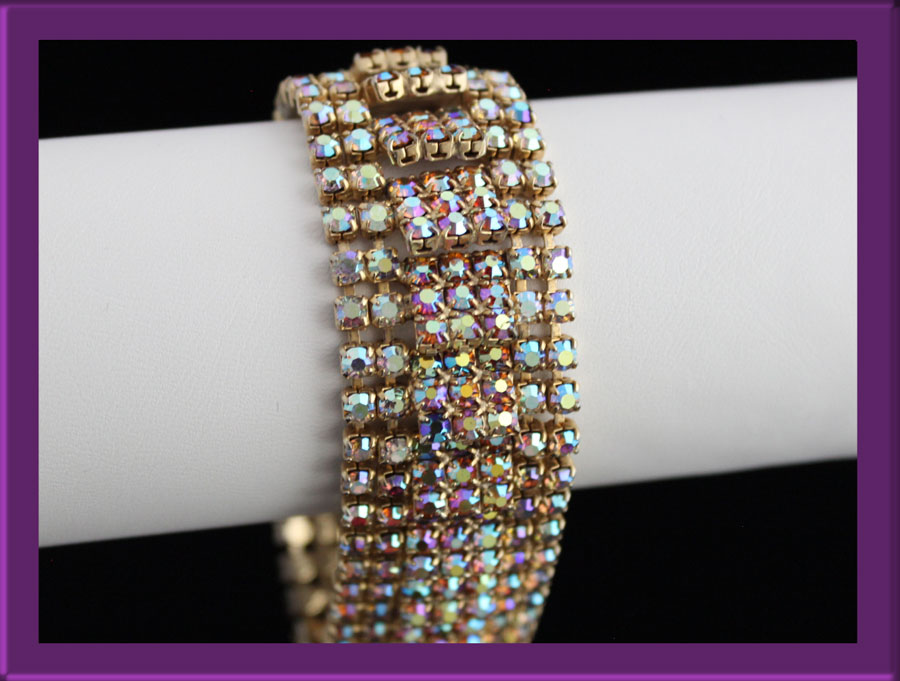 This is a very lavish signed Alice Caviness articulating bracelet. Beautiful chaton aurora borealis rhinestones dominate this gold tone 7 row bracelet. You will notice that the center 3 rows have movement--as it wraps around the wrist the center 3 rows 'lift' giving it a dimensional look. It draws your attention to the flashing aurora borealis stones. It has an open box lock closure with a safety chain. You will find the Alice Caviness hallmark on an oval cartouche on the box closure. Alice never produced her jewelry in mass production and always used the best of materials making her jewelry rare on the collectibles market! This sparkling bracelet is in like new condition. It appears to be seldom worn if worn at all. A gorgeous bracelet you won't want to miss! This highly prized find is very well constructed and in very good vintage condition, the rhinestones are brilliant and the gold tone metal has little appearance of wear. This would make a lovely addition to your Alice Caviness collection. ID-647