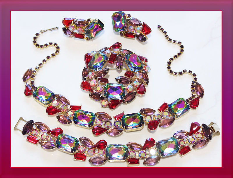 If you have seen DeLizza & Elster jewelry, often referred to as Juliana, then you already know that it is typically big, bold and beautiful! Today, as forty years ago, this jewelry gets noticed. The designers spared no imagination in their combinations of shapes and colors and you can find glitzy rhinestones and gorgeous art glass combined in striking creations. D&E jewelry was made to last and the quality of workmanship is remarkable. It is not unusual to find vintage D&E pieces in excellent condition with all the original stones intact.