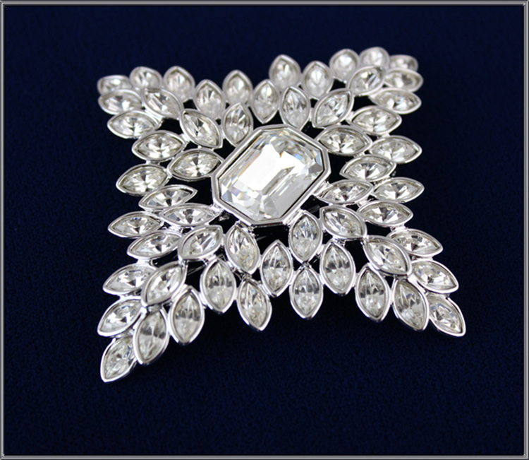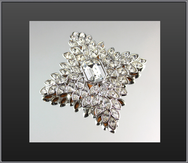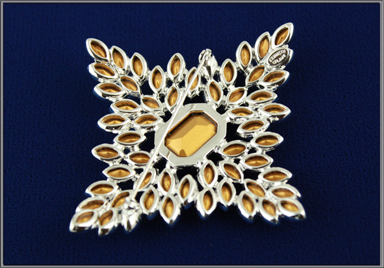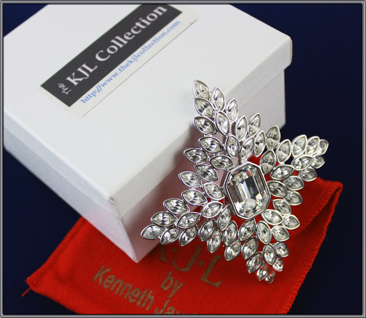 I can see with little doubt why Kenneth Lane and Jackie O' had a mutual admiration. He can really produce some lovely and sophisticated jewelry. And I think most agree that Jacqueline Kennedy Onasis was the epidemy of sophistication. Now you have a chance to wear something that was fashioned for Jackie O' by Kenneth J. Lane. The Cruciform Brooch was designed by Kenneth Lane for Jacqueline Onassis. In 1996, the actual brooch and a bracelet sold at auction for $19,550. This is not only lovely but impressive! While taking photos I really could see what all the fuss was about. The center emerald shaped stone has such depth...really stunning. This center stone is Austrian crystal and it does not disappoint. The many marquise rhinestones which surround the center stone seem to be ordained in their placement...like a snow flake. So lovely! I don't believe you can find these through your retail stores any longer, so don't miss your chance to snag this one. It comes with a KJL Box. ID-BXD24