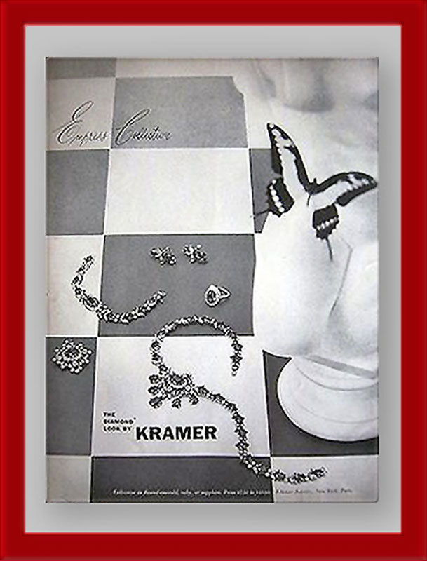 Louis Kramer opened his firm in New York City in 1943 and made a range of variously priced costume jewelry for the following 30 years. Like Weiss he was a believer in stone-rich designs, a look that found particular favor in the 1950s climate of dressed-up glamour. Kramer used a wider variety of paste than either Weiss or post-war Eisenberg designing pieces decorated with textured or “crackled” glass, crystal beds, colored pearls, and even plastics. Rhinestones overlaid with black fishnet are another distinctive Kramer innovation, and this interesting fusion of clothing and jewelry elements has made these unusual net pieces highly desirable for today’s collectors. Another collectable line is the series of jewels that Kramer manufactured in the United States for Christian Dior. While not as valuable as Dior’s French, English or German produced pieces, “Dior By Kramer” is eagerly collected and prices continue to rise.