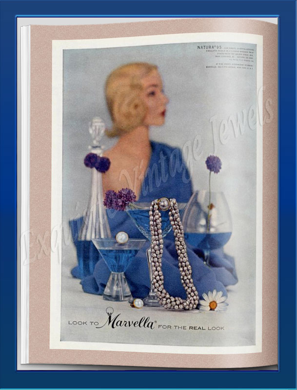 The Marvella jewelry produced used many trademarks. Marks: "Marvella" in script on pearl necklaces, pearl earrings, and pearl bracelets, since Jan. 1911, "Marvella MINERVA QUALITY" for pearl necklaces, pearl earrings, pearl bracelets and pearl brooches and other pearl jewelry with stones since Jan. 1939, "Marvella SIMULATED PEARLS, They're Nature Dipped" since Jan. 1941, "Marvella Replica of INDIAN OCEAN PEARLS" since 1941, "MARVELLISSIMO" for necklaces, bracelets, earrings, clips, brooches, lockets, finger rings, charm bracelets, and charms since January 1948, "Marvella Pearl Nuggets" since 1948, "Marvella Fabulous" in script since January 1949, "Marvella SNUG-FLEX" since April 1950, "Natura" in script since May 1954, "Natura "95" in script since June 1954, "MARVELLA with a copyright symbol" after 1955, "MATURELLE" for simulated pearls since June 1957, "MARVELLIER" since January 1958, and "MARVELLETTE" since September 1958 "MARVELLESQUE" since June 1958, FRESHURA" since December 1958, "MARVELLESCENCE" on necklaces, brooches, earrings etc. as well as beads, pins and jewelry initials made of or plated with precious metal since June 1963.