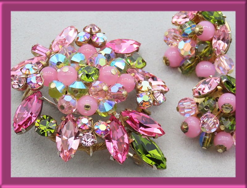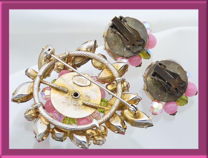 This is such a tasteful brooch and so ultra feminine. This set confused me a little because of the difference between the brooch back and earring backs. Judging by the look of the earrings from the back I would date this an earlier set. The brooch back leads me to believe it is a later piece than that of the earrings. The only difference I can see is that the cap of the pink beads are a bit different than those on the brooch and the earrings have greens beads where the brooch does not. No matter what, this is a lovely Regency Jewels Demi.. Judge for yourself. This would be perfect for so many outfits and occasions, but I can see this as the perfect adornment to a lovely Easter outfit. ID-178