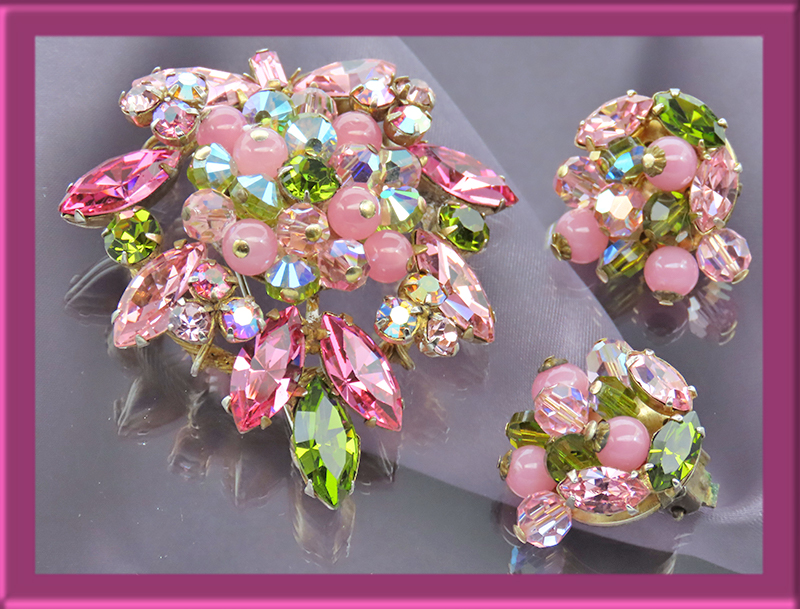 Regency-Jewels-pink-brooch-and-earrings-with-pink-beads-pink-and-green-rhinestones
